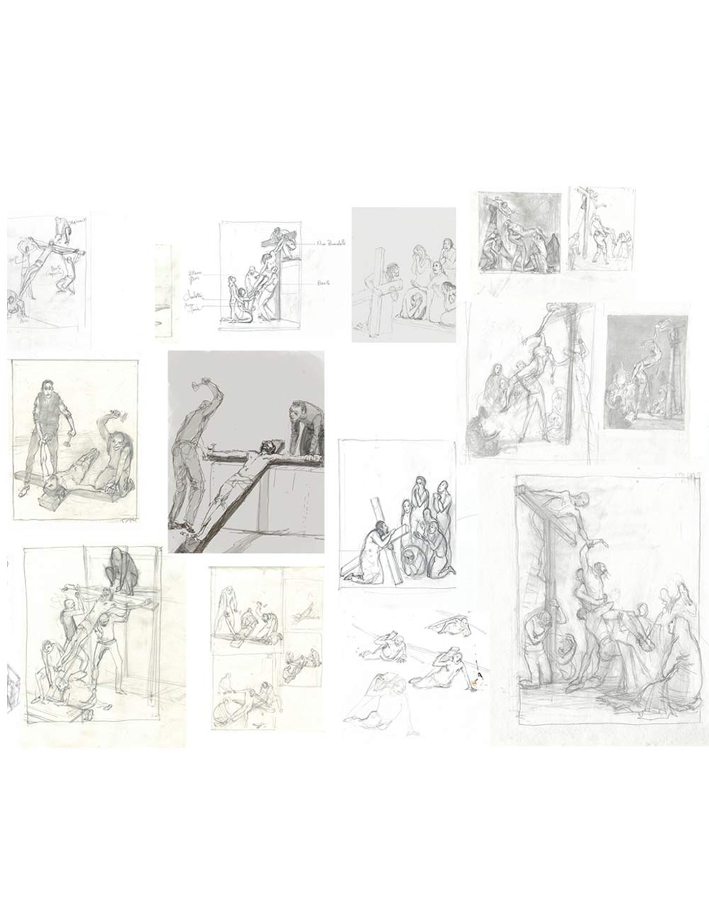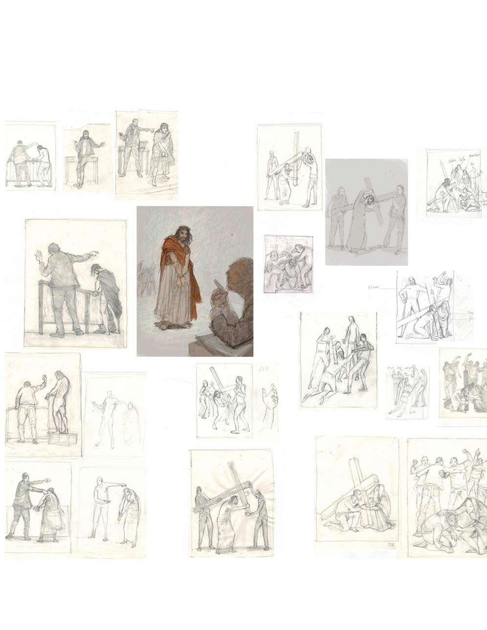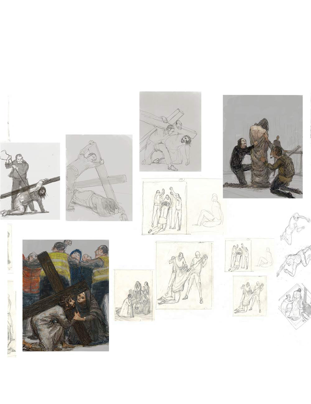 Il m’a fallu dessiner des dizaines de croquis, puis peindre à l’huile pendant 4 mois l’ensemble du cycle sur un demi-format, enrôler mes anciens élèves en leur expliquant l’Histoire, préparer les tableaux vivants en fabriquant une croix de 3m50 et 70kgs et y crucifier sans douleur un élève s’appelant Elie et sosie du Christ, aller au bout de 3 journées de poses avec à chaque fois une quinzaines d’acteurs bénévoles et bouleversants de générosité et de justesse... J’ai ensuite préparé mes 15 panneaux de bois à l’ancienne comme les peintres d’icônes, à l’aide de 7 couches poncées d’enduit traditionnel. Je pouvais enfin commencer la peinture des Stations !