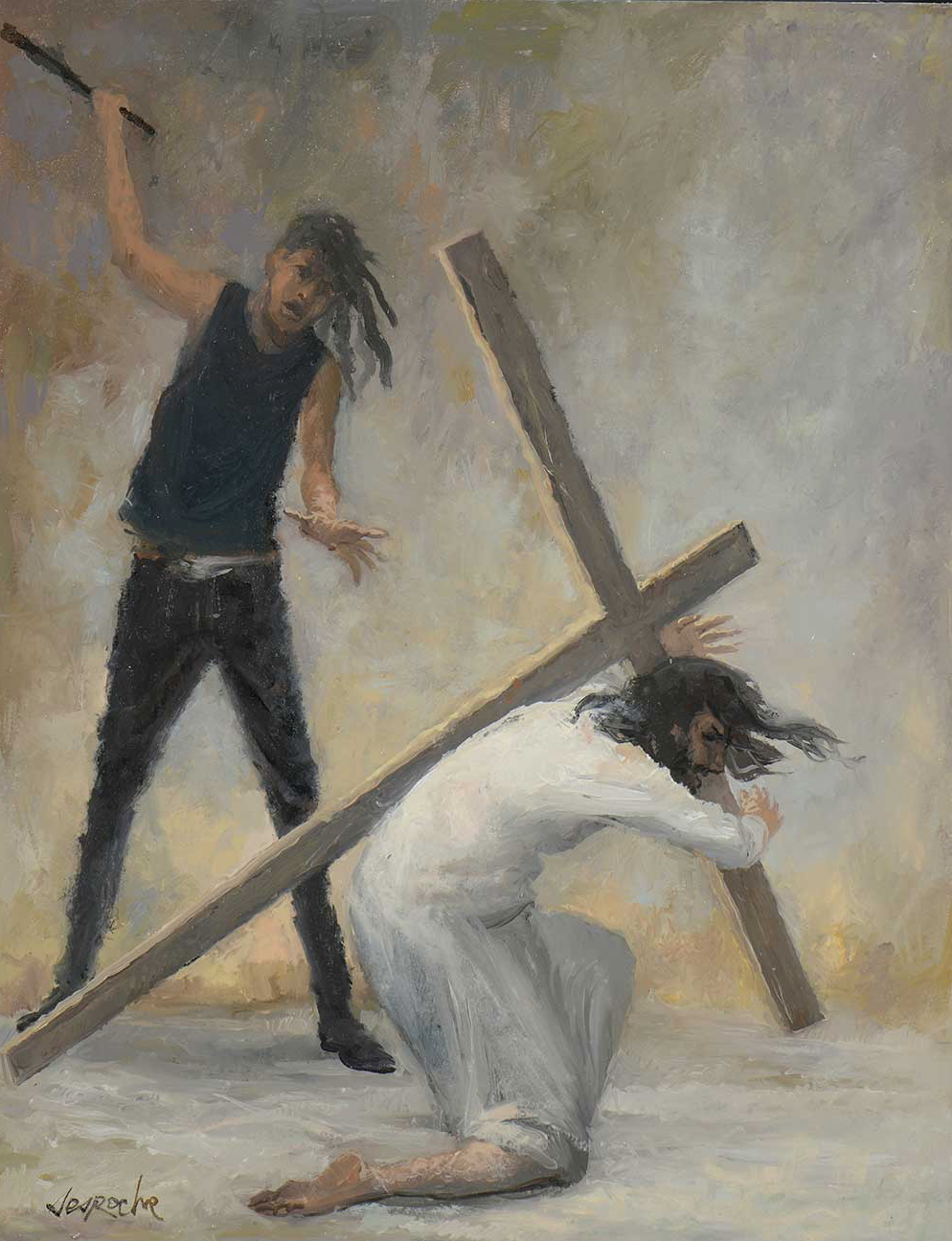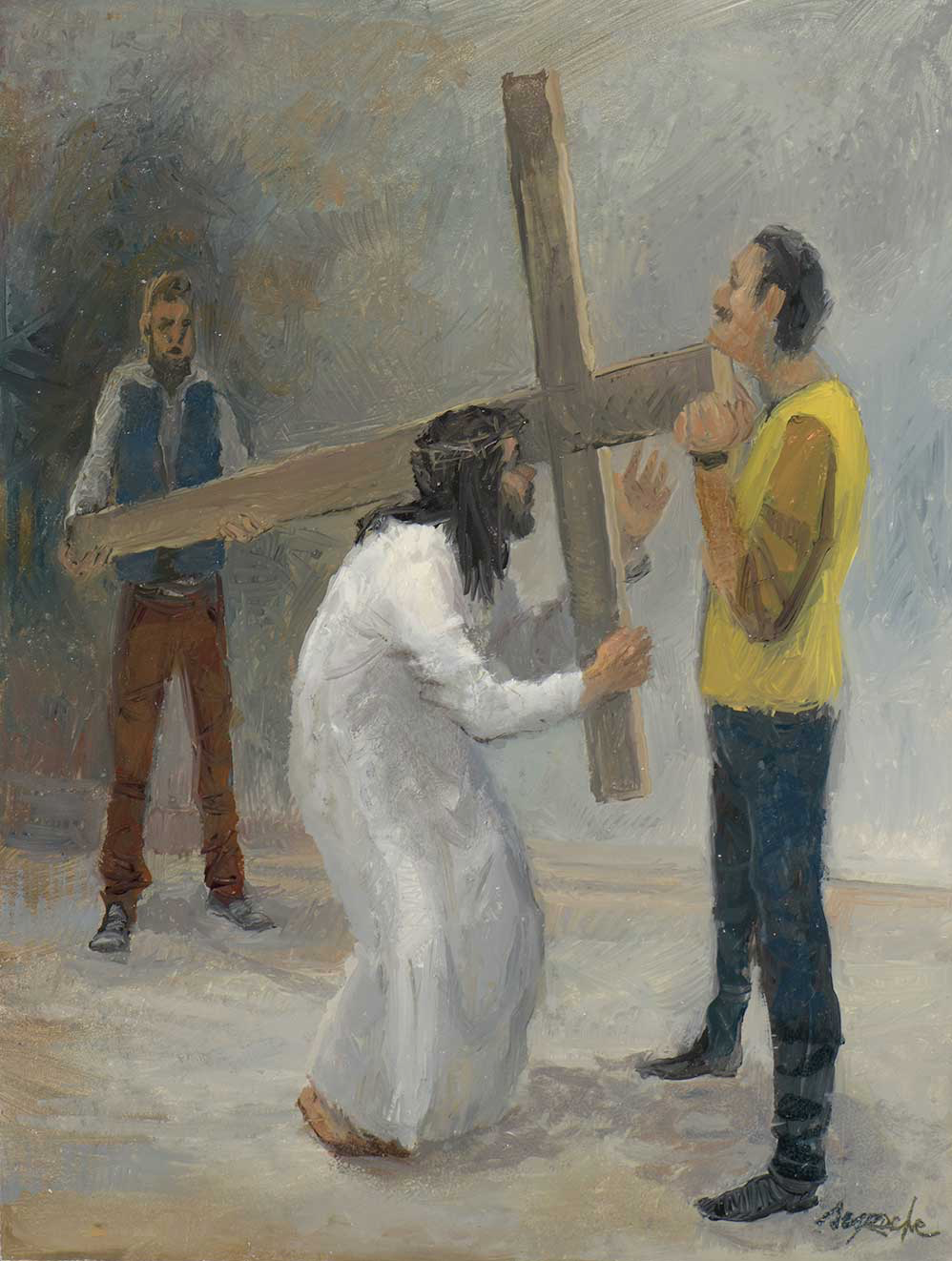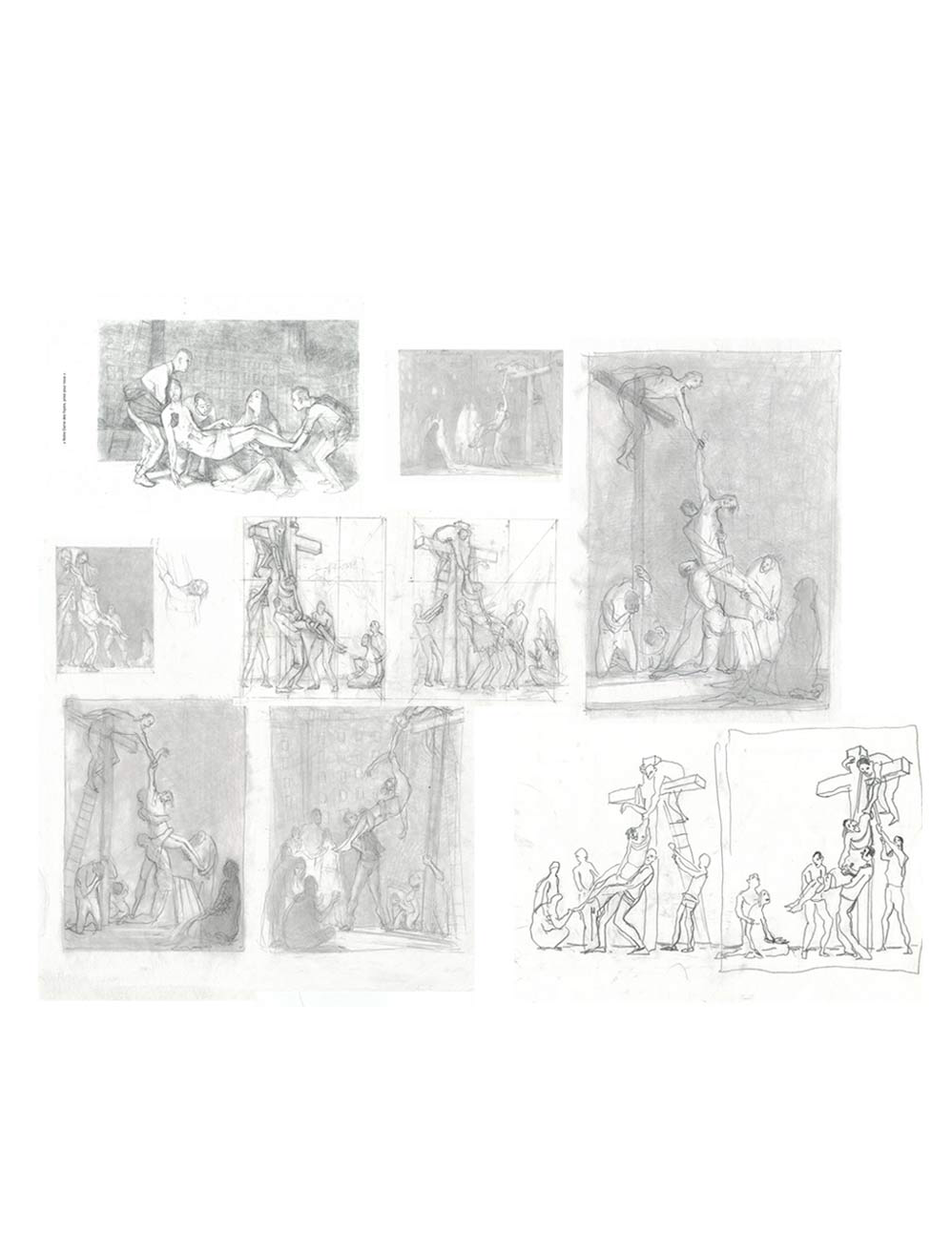 Il m’a fallu dessiner des dizaines de croquis, puis peindre à l’huile pendant 4 mois l’ensemble du cycle sur un demi-format, enrôler mes anciens élèves en leur expliquant l’Histoire, préparer les tableaux vivants en fabriquant une croix de 3m50 et 70kgs et y crucifier sans douleur un élève s’appelant Elie et sosie du Christ, aller au bout de 3 journées de poses avec à chaque fois une quinzaines d’acteurs bénévoles et bouleversants de générosité et de justesse... J’ai ensuite préparé mes 15 panneaux de bois à l’ancienne comme les peintres d’icônes, à l’aide de 7 couches poncées d’enduit traditionnel. Je pouvais enfin commencer la peinture des Stations !